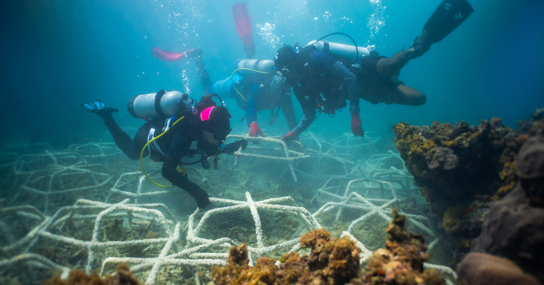 A team of researchers monitor artificial structures where coral will grow in Dominican water. Photo: FUNDEMAR